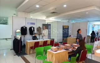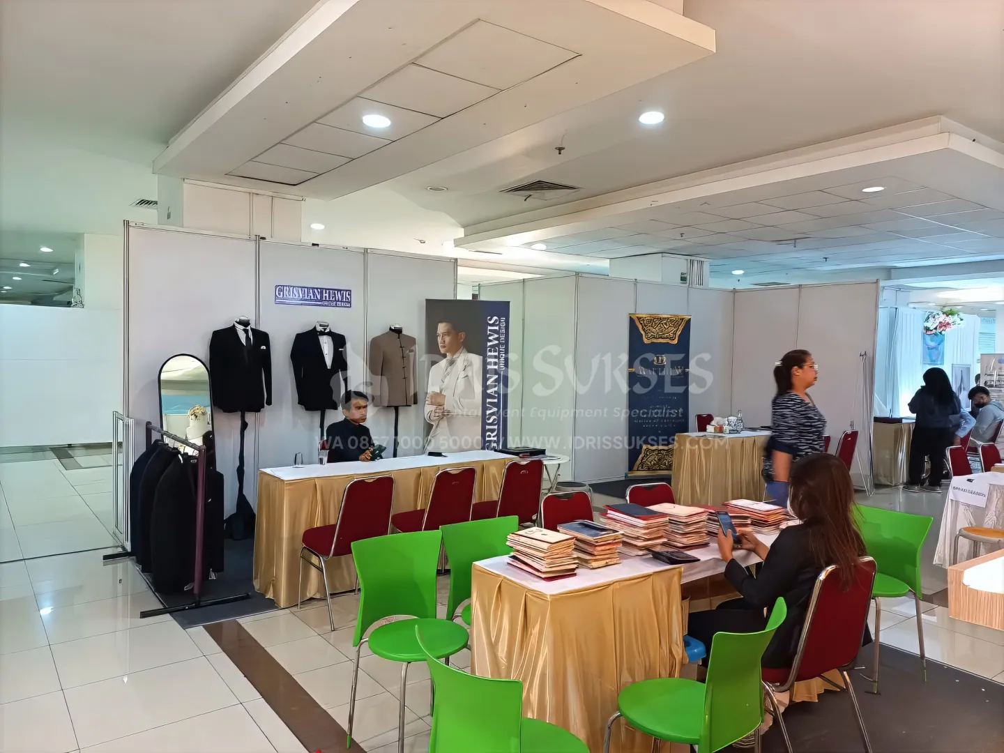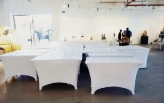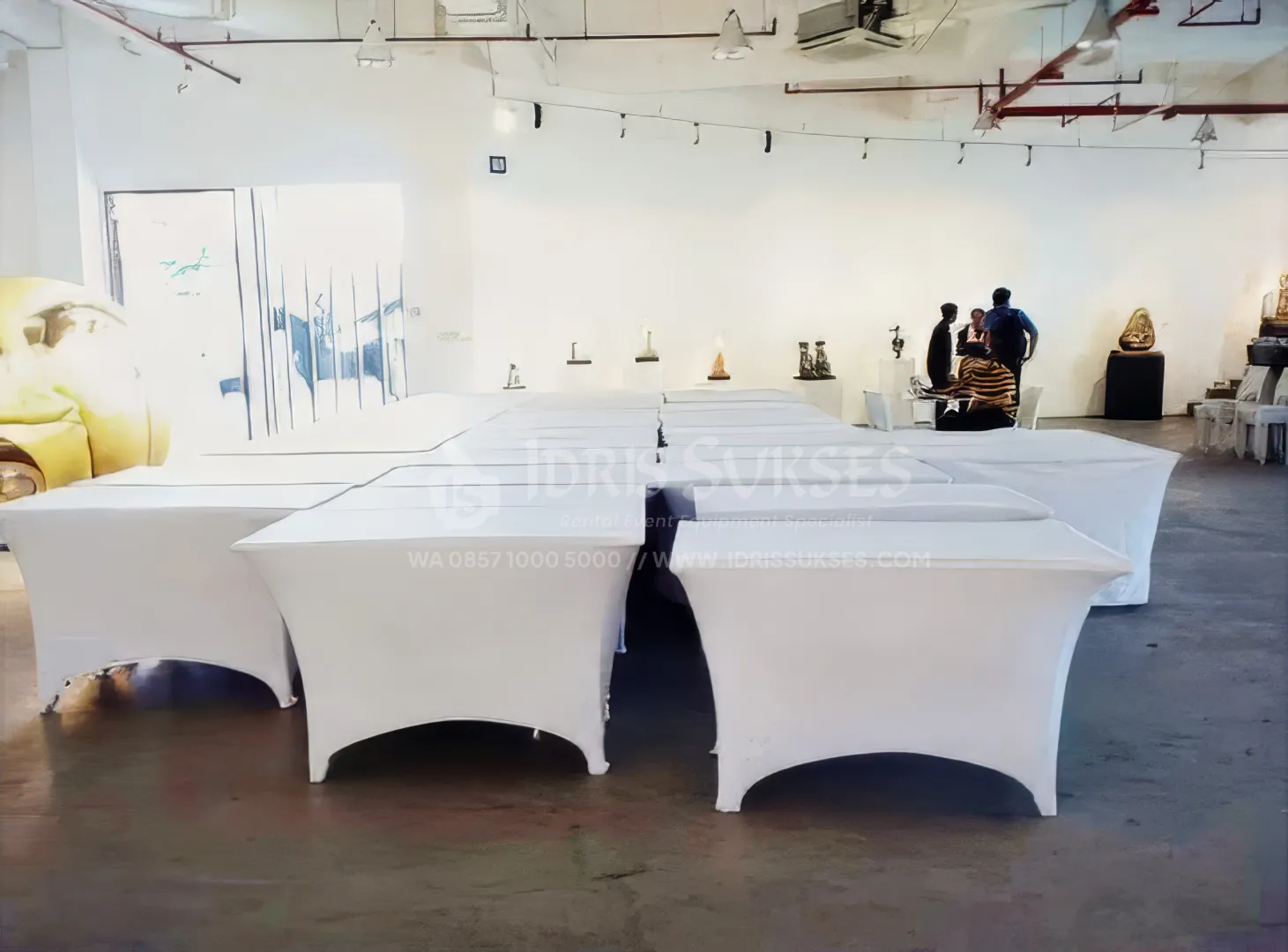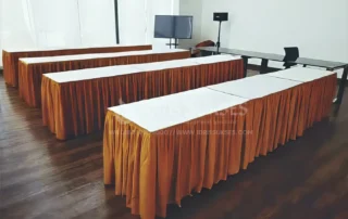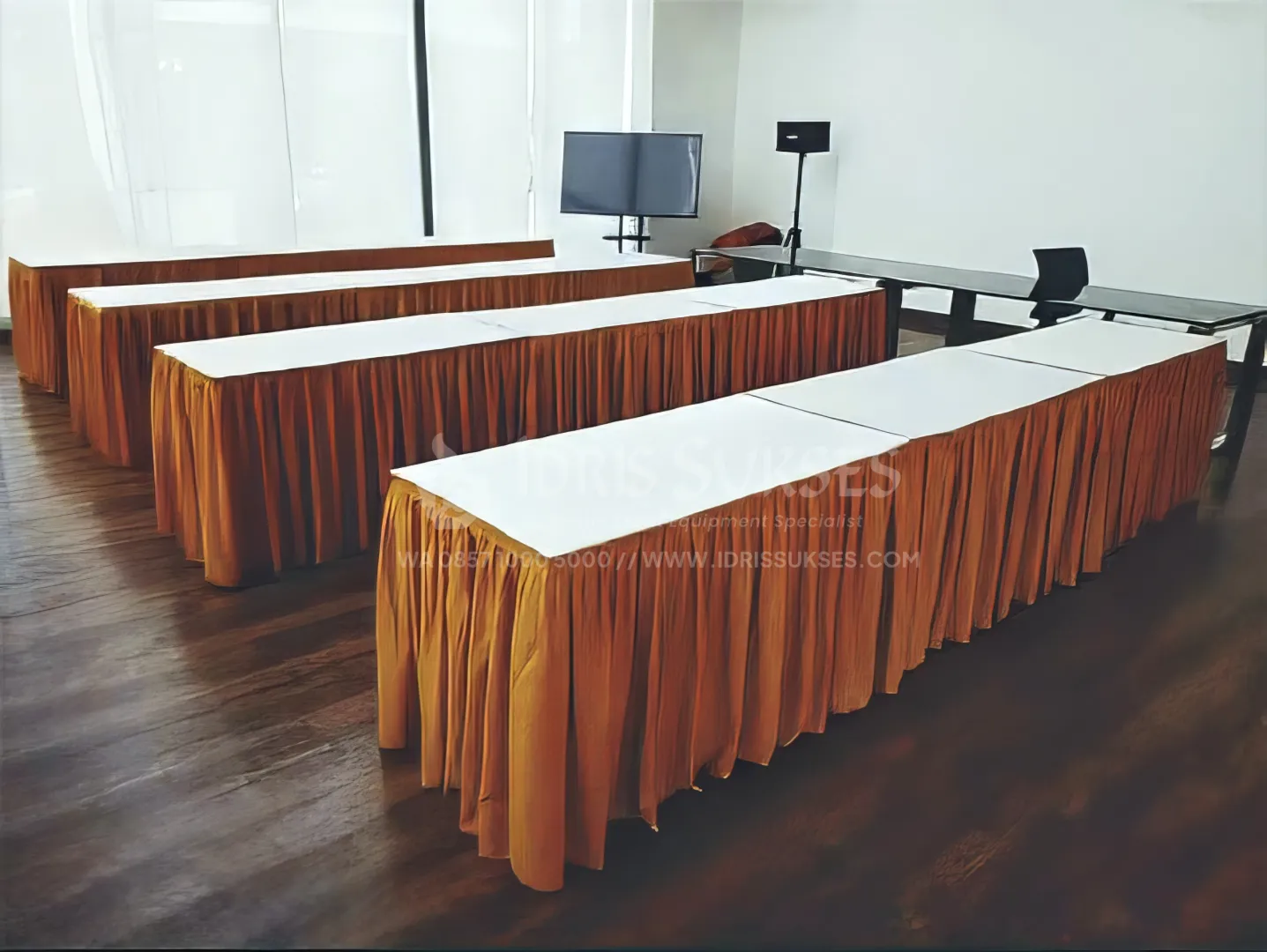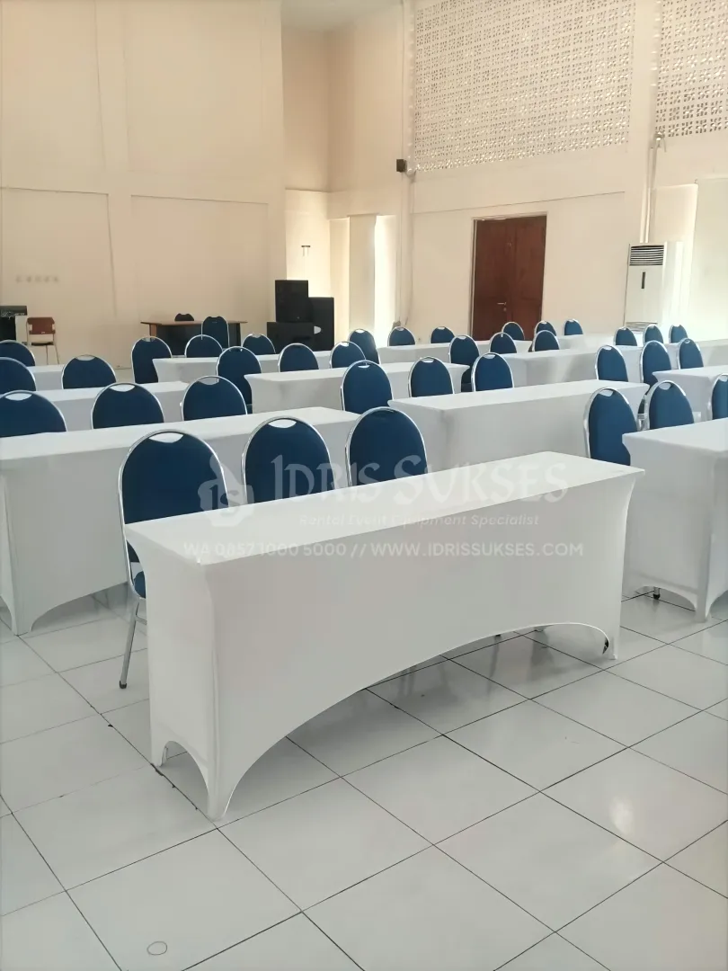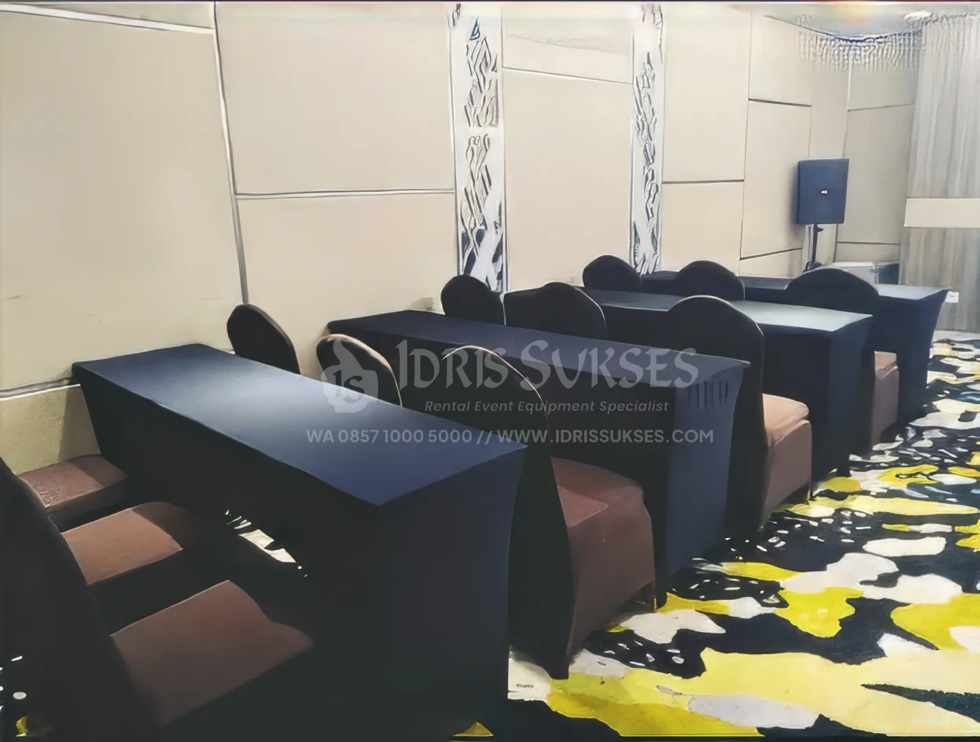 Meja panjang standar event yang dilengkapi cover meja, digunakan untuk kebutuhan operasional dan tampilan formal pada acara instansi maupun perusahaan.