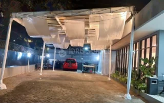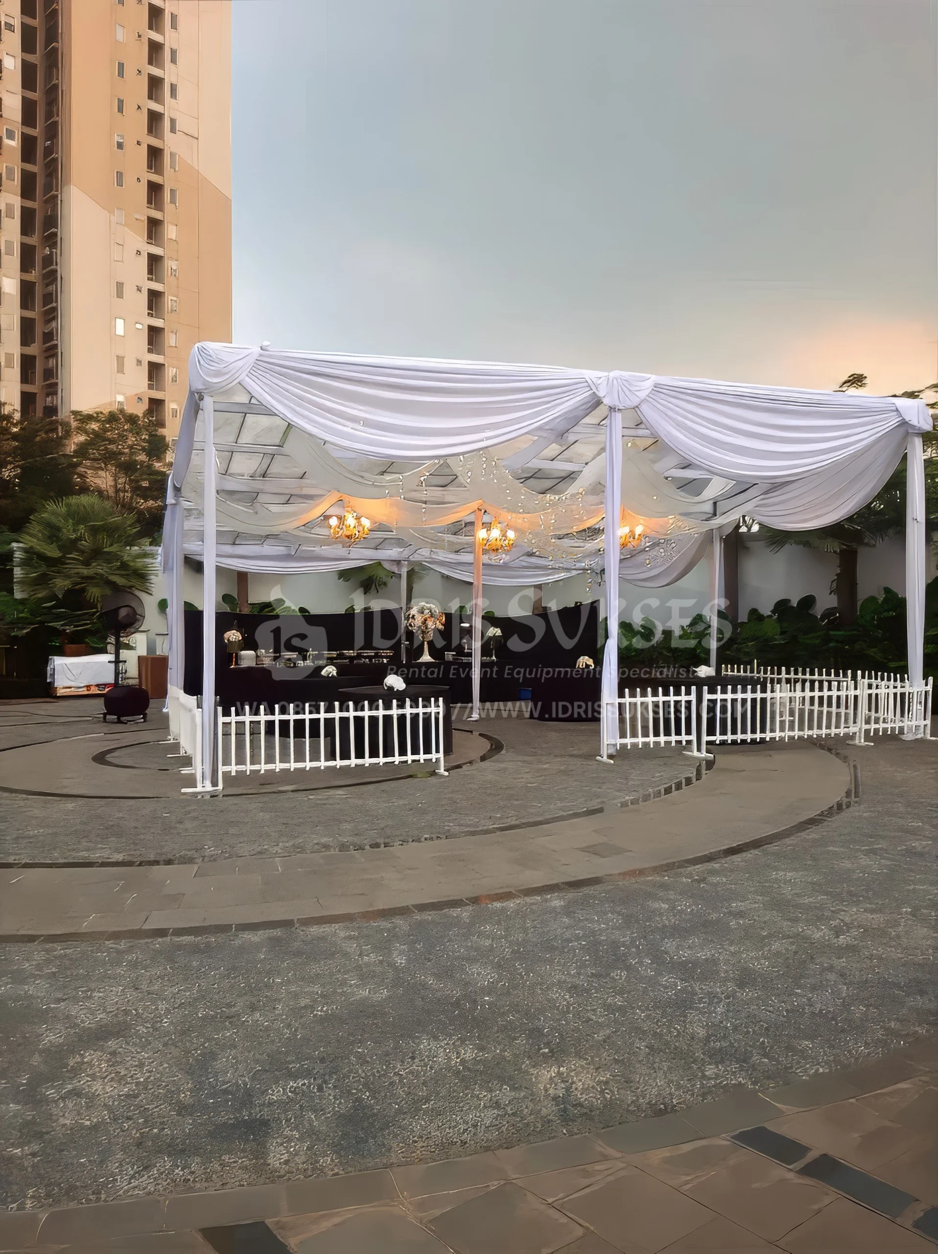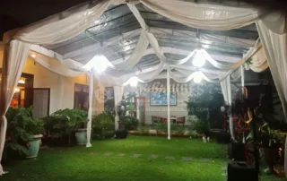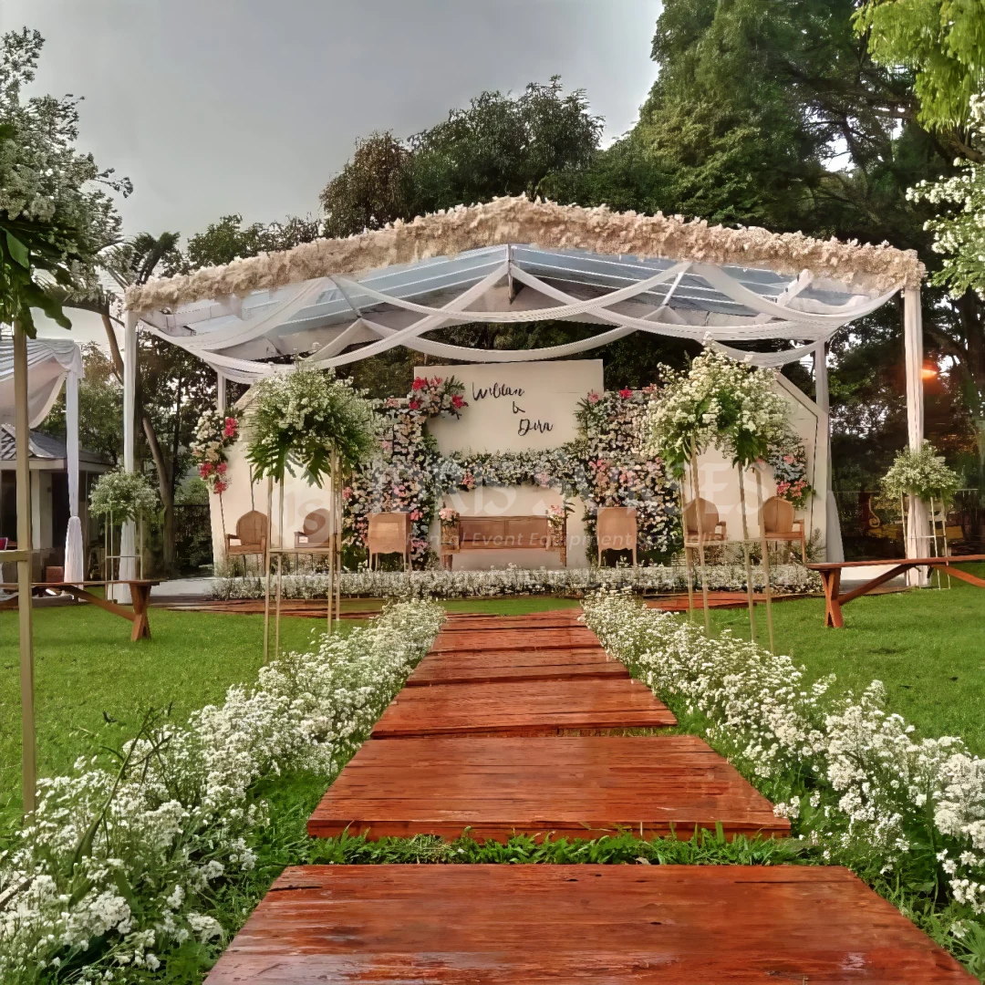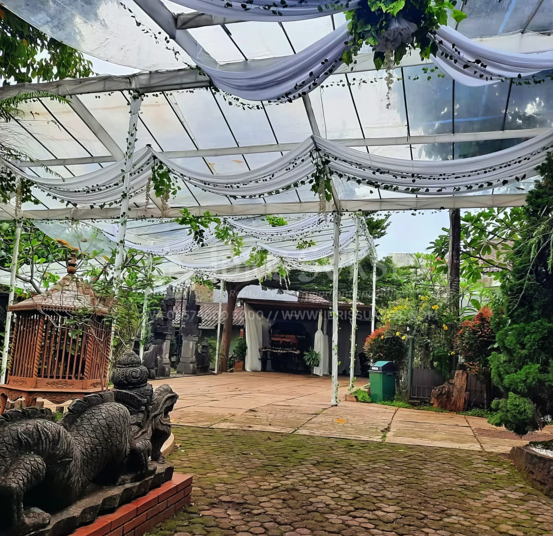 Tenda konvensional dengan atap dan/atau sisi transparan untuk acara outdoor. Memberi perlindungan dari cuaca tanpa menutup pencahayaan alami. Cocok untuk acara siang atau malam yang ingin tetap terang dan terbuka. Umum dipakai untuk pesta, gathering, dan event semi formal.