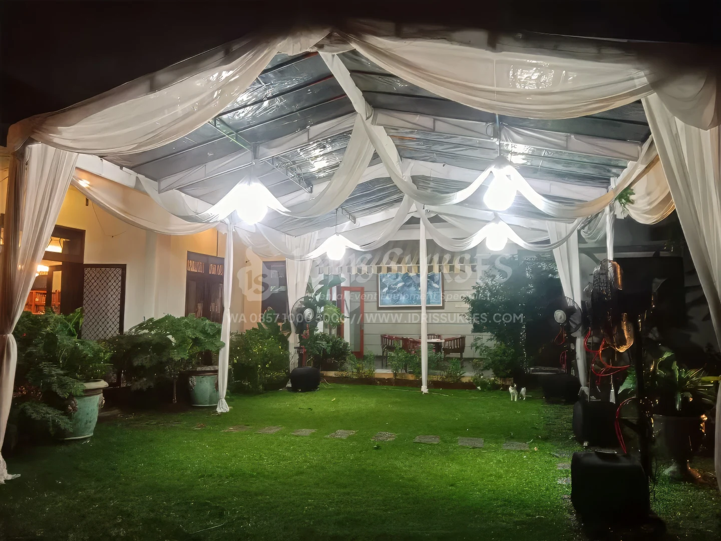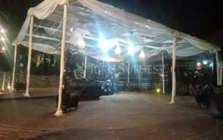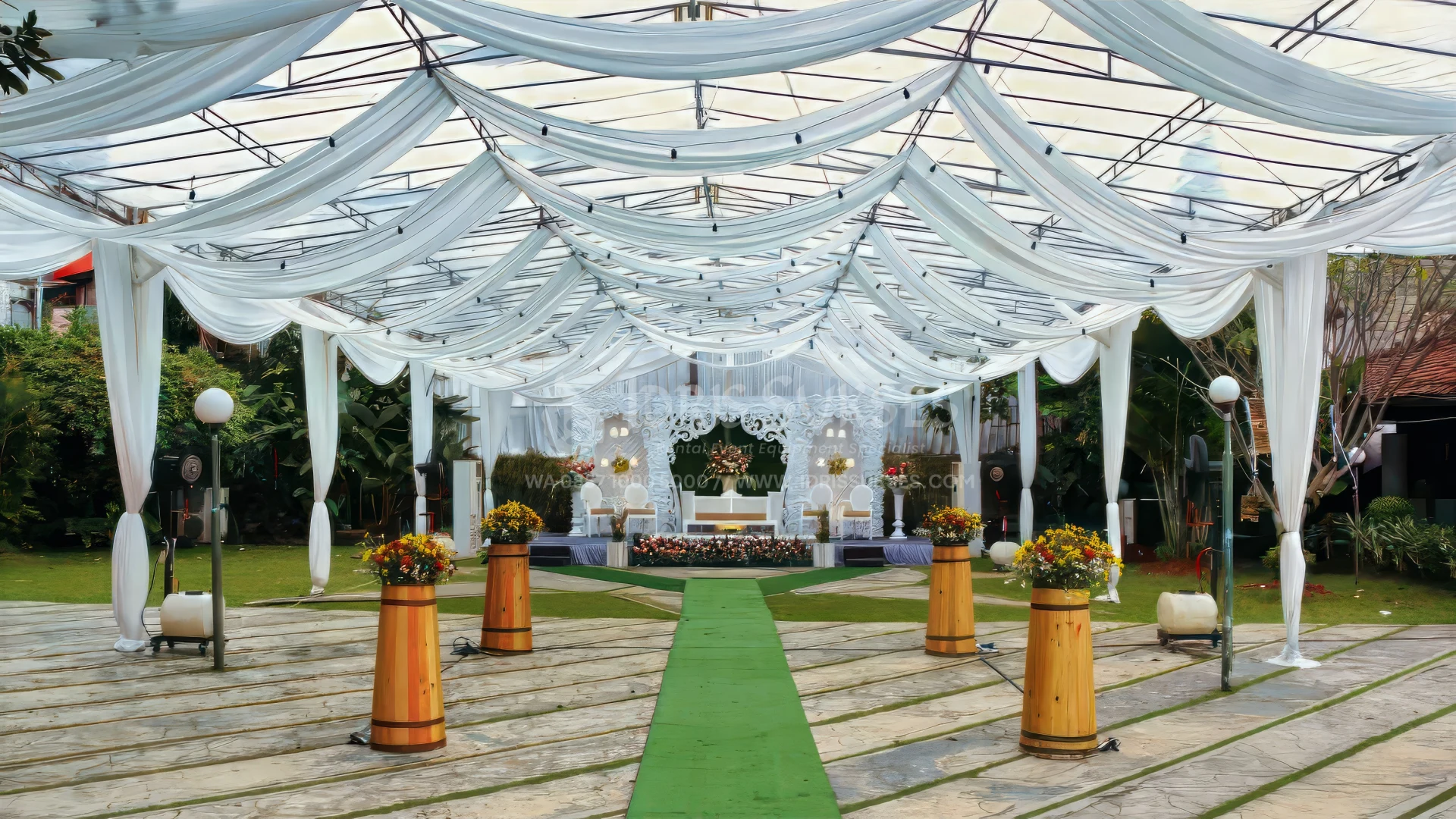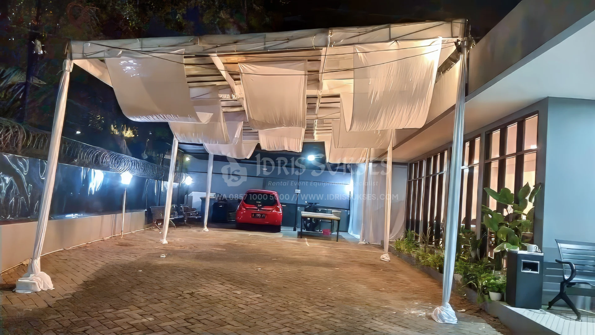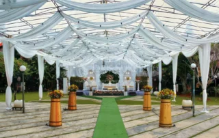 Tenda konvensional dengan atap dan/atau sisi transparan untuk acara outdoor. Memberi perlindungan dari cuaca tanpa menutup pencahayaan alami. Cocok untuk acara siang atau malam yang ingin tetap terang dan terbuka. Umum dipakai untuk pesta, gathering, dan event semi formal.